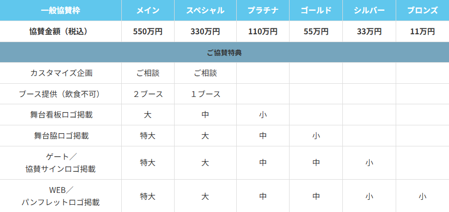 | 一般協賛枠 | メイン | スペシャル | プラチナ | ゴールド | シルバー | ブロンズ |