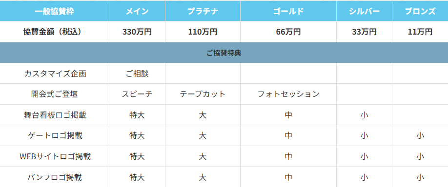 | 協賛金額(税込) | 330万円 | 110万円 | 66万円 | 33万円 | 11万円 | |
